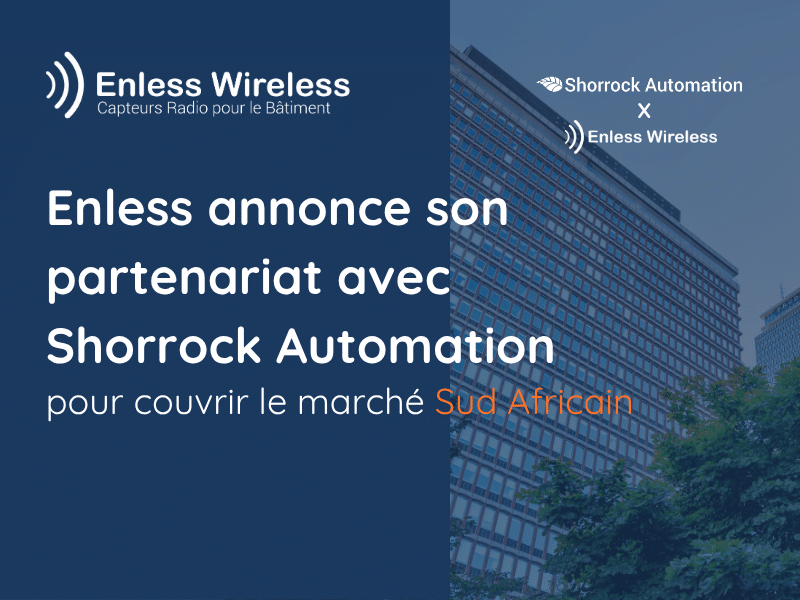 « Nous sommes ravis d’officialiser notre partenariat avec Enless Wireless, fabricant de capteurs radio IoT et M2M. Cette collaboration nous permet d’offrir sur le marché Sud Africain une solution clé en main, partant du capteur jusqu’au contrôleur, pour des applications d’automatisme et d’efficacité énergétique dans le bâtiment. La gamme de produits LoRa(WAN) Enless couvre un large panel d’applications et répond aux besoins du terrain. L’offre Enless est parfaitement complémentaire aux produits historiquement déjà distribués par Shorrock Automation. » – Chris Cronje, CEO Shorrock Automation.